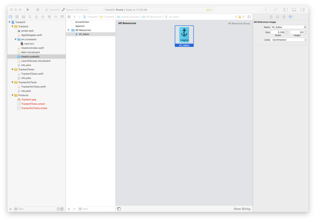 We can open the Assets.xcassets and see a single file within the AR Resources folder, this is the image that the AR engine will detect. If you print this image out your AR application could detect it using your devices camera.