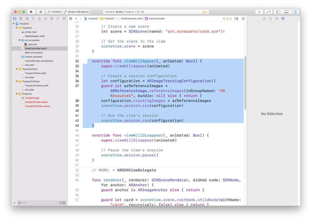 Back in the ViewController.swift file we can look at the viewWillAppear function. Here we can see that the AR Resources folder is being used and then setting it to the trackingImages member of the ARImagetrackingConfiguration Class.