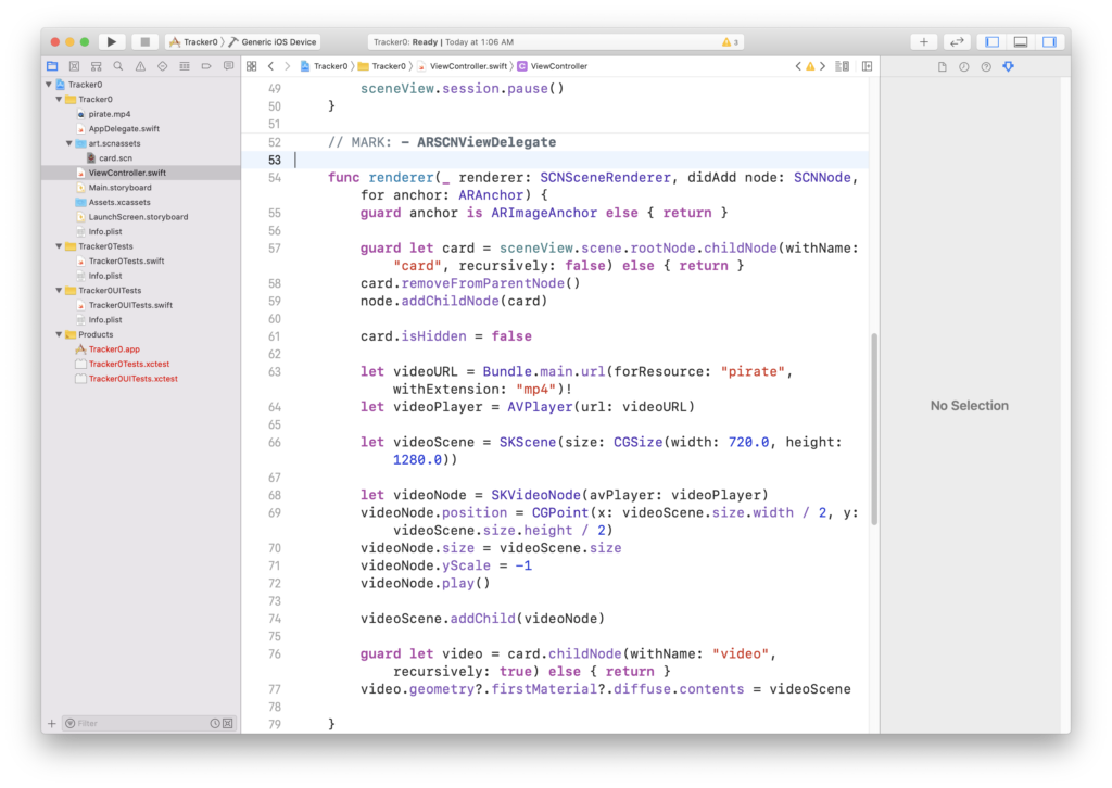 In the same file we have a renderer function, which is built into our AR Scene View Controller. In this function we can use it to display the 3d model (card scene) when it detects a image. Aswell we can use this function to display a video in the grey area on the card scene.